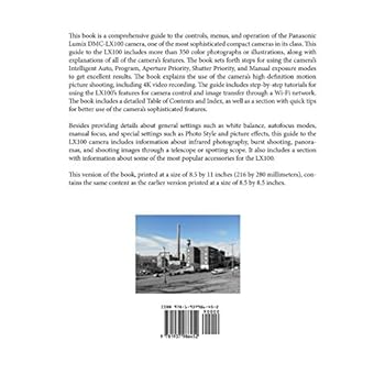 This book is the larger-sized paperback version of Photographer's Guide to the Panasonic Lumix LX100. This version of the book contains the same content as the earlier version, which was published in January 2015 with dimensions of 8.5 by 8.5 inches (216 by 216 mm). The new version of the book, which replaces the original version, is being published at a size of 8.5 by 11 inches (216 by 280 mm) in order to present more information on each page, which keeps related images closer to the text they illustrate and reduces the page count, making the book easier to manage. The book contains more than 350 color photographs showing the camera's controls, display screens, and menus. The guide also includes examples of images captured using the many creative settings of the camera, including the Photo Style settings; the Filter button picture effects, which provide the ability to customize the appearance of images in dramatic ways; and the camera's features for continuous shooting and shooting in high-contrast lighting conditions. The book also includes a full discussion of the video recording abilities of the LX100, which offers manual control of exposure and focus during movie recording, and which provides ultra-high definition 4K recording of motion pictures.